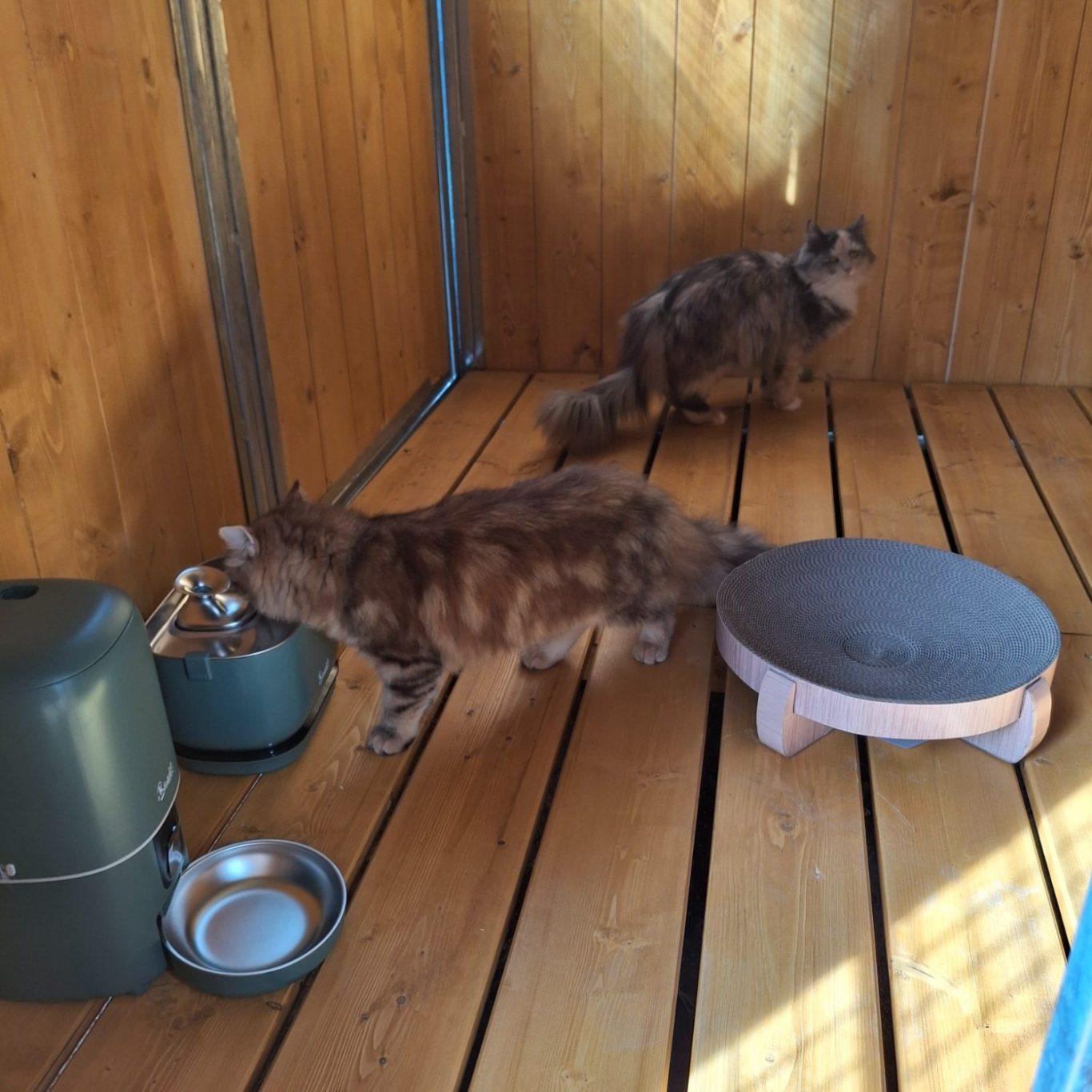 Chaque lodge est équipé d'une fontaine à eau, d'un distributeur de croquettes et bac à litière autonettoyante.